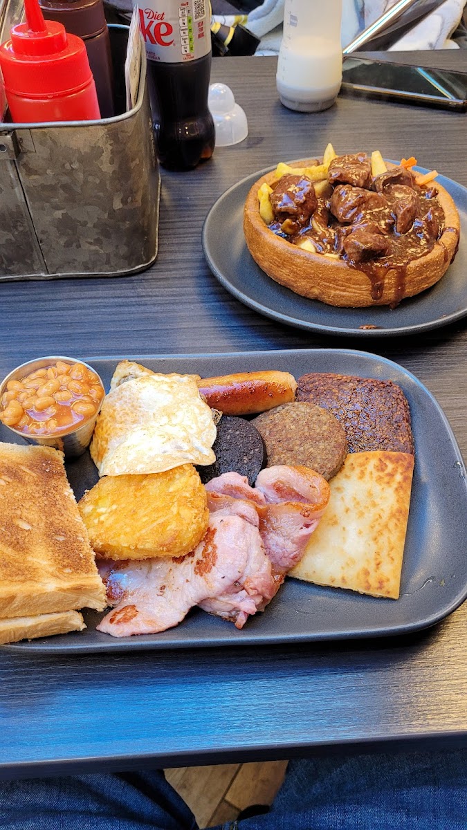 Small cafe in an industrial estate, great menu selection available for sit in or takeout, staff are friendly and the banter is spot on, cash or card, decent prices for decent portions, steak pie was awesome and the honey chilli chicken is always a great choice. Will definitely return for the food and the banter.